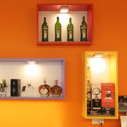 Das Geschäft wirkte vor dem Umbau durch den schlauchähnlichen Grundrisszuschnitt ein wenig düster. So entschieden sich die beiden Betreiberinnen den Laden einmal zu überdenken und neu gestalten zu lassen. Auf der Schaufensterseite werden Obst und Gemüse jetzt auf einer langen Auslagetheke – wie auf einem Markt – frisch präsentiert. Auf der gegenüberliegenden Seite bieten beleuchtete Rundbögen Platz für Einbauregale, in denen Weine und Lebensmittel angeboten werden. Hinter der Theke für Käse- und Wurstspezialitäten befindet sich jetzt ein farbenfrohes Rückbuffet mit dreidimensionalen Kuben für die Präsentation besonderer Produkte. Auch durch ein spezielles Beleuchtungskonzept wirkt das Ladenlokal jetzt frisch und jung.